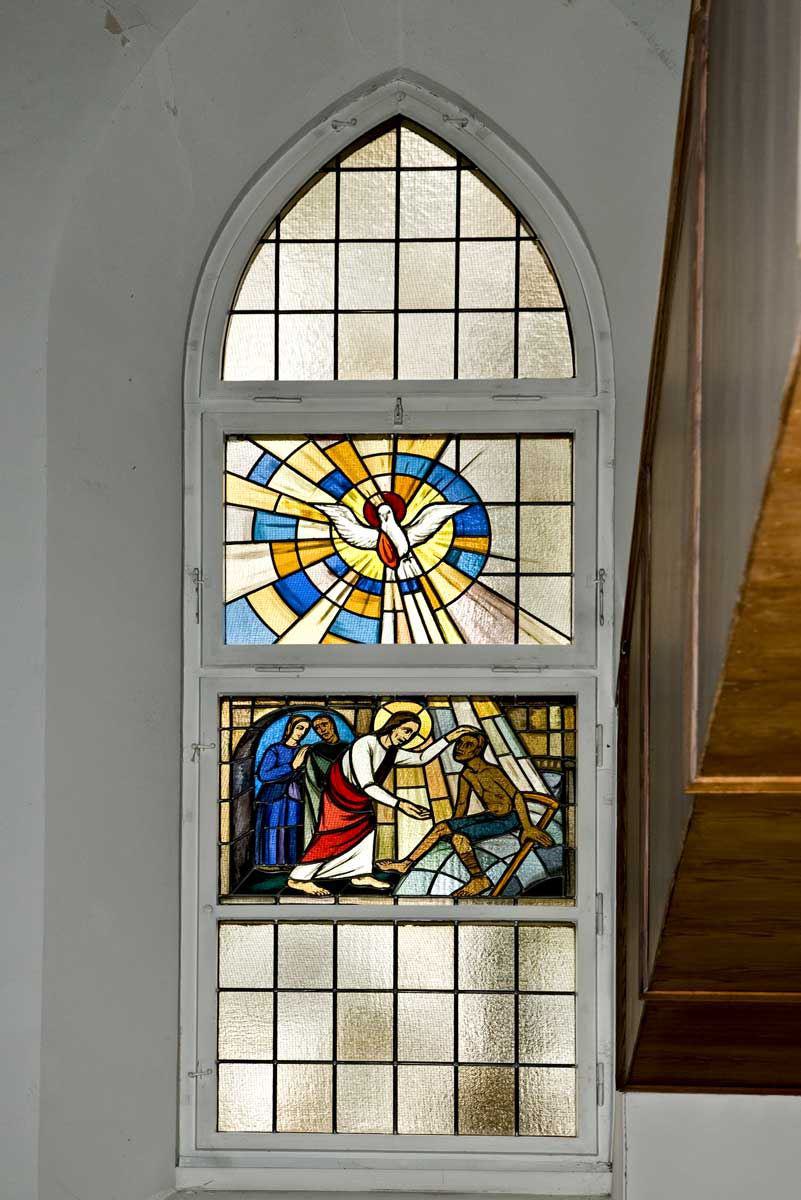 Bei der Heilung des Gelähmten (Mk. 2,1-12) erscheint im oberen Teil des Fensters die Taube als Symbol des Heiligen Geistes. In den Evangelien wird berichtet, dass Jesus dem Kranken die Sünden vergibt, ehe er ihn heilt. Die Vergebung der Sünden geschieht durch die Kraft des Heiligen Geistes. Deshalb wird der Kranke von einem Strahl, der von der Taube ausgeht, umfangen. Die Flamme neben der Taube erinnert an Pfingsten, das Fest des Heiligen Geistes. Während sich die Jünger im Tempel versammelten, erschienen an Pfingsten Flammen auf ihren Häuptern.