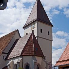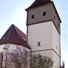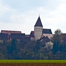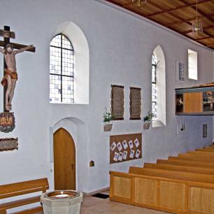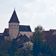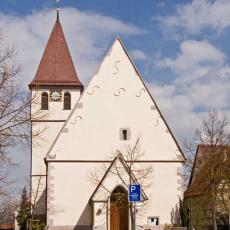 " Beinahe in der Mitte des Orts steht die 1469 in einfachem germanischen Styl erbaute Pfarrkirche, welche übrigens in den Jahren 1699 und 1817 stylwidrige Veränderungen erlitten hat. Der viereckige Thurm, von dessen drei Stockwerken die zwei untersten massiv erbaut sind, ist nicht hoch und ragt nur mit seinem einfachen Zeltdach über den First der Kirche empor; auf demselben hängen drei Glocken, von denen eine, im Jahre 1512 gegossene, sehr groß ist, die mittlere ist von 1629, und die kleinste, sehr alte, trägt die vier Evangelistennamen in verkehrter ganz roh ausgeführter Schrift. Das Innere der Kirche hat außer einem alten Taufstein und einem gut aus Holz geschnittenen, in neuerer Zeit kunstlos angestrichenen, lebensgroßen | Bild des Gekreuzigten nichts Bemerkenswerthes. Das untere Stockwerk des Thurms hat ein Kreuzgewölbe mit dem Christuskopf auf dem Schlußsteine, und trägt noch einzelne Spuren romanischer Bauweise, welche bekunden, daß der Thurm weit älter ist, als das gegenwärtige Langhaus. Die Baulast der Kirche hat zu 2/3 die örtliche Stiftungspflege und zu 1/3 der Heilige in Nebringen zu bestreiten. Der ummauerte, ziemlich große Begräbnißplatz liegt außerhalb (östlich) des Orts."