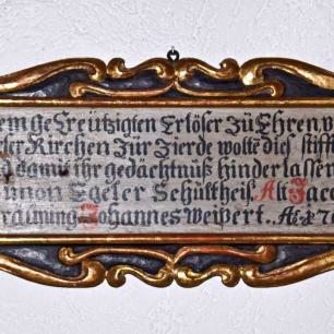 In einer Kombination aus Kreuzweg- und Rosenkranzdarstellungen sind an der Emporebrüstung 9 Bilder angebracht.