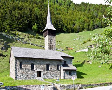 "Erbaut zwischen dem 11. und 13. Jahrhundert, anstelle einer im 9. Jahrhundert vom Kloster Disentis errichteten Kapelle.