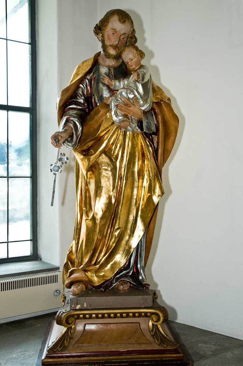 Nach dem Umbau der Kirche wurden die 14 Kreuzwegstationen in zwei 7er-Gruppen ganz hinten neben dem Eingang an der Südwand (1 - 7) und Nordwand (8 - 14) eng zusammen aufgehängt. Bei den Stationen 8 - 14 (Nord-West-Ecke) steht außerdem eine Statue des Hl. Josef mit dem Jesuskind:
