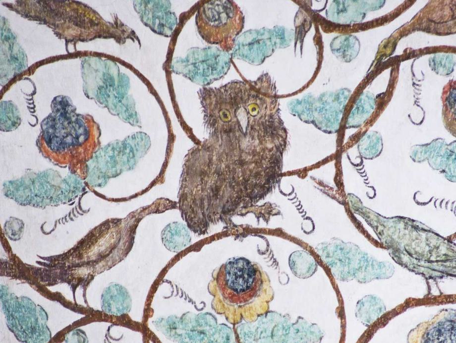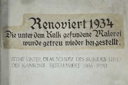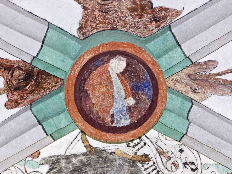 Die Bilder im Deckengewölbe wurden anlässlich der Renovation von 1934 freigelegt. Im Mittelfeld sind die Symbole der vier Evangelisten gemalt, auffallend sind die Darstellungen des Todes in den Zwickeln, in denen der Tod nicht als Gerippe dargestellt ist. Datiert sind sie mit 1518."