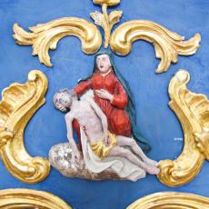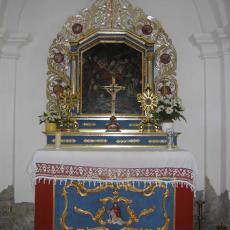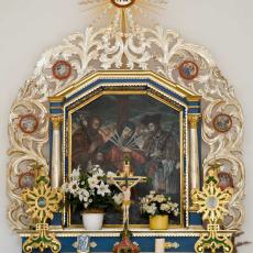 - Altarbild der Schmerzhaften Muttergottes mit Rahmen, das Altarbild ist von zwei geschnitzten Brettern (gefasst und vergoldet) flankiert. Bei den genannten Brettern dürfte es sich umSeitenwände eines früheren Tabernakels handeln.
