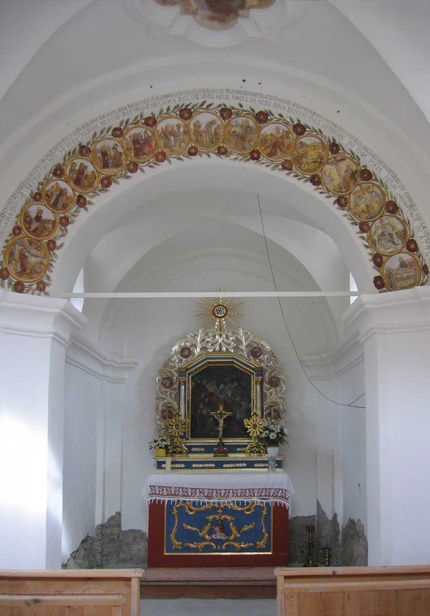 Restaurierung 1996; nach Absprache mit allen Beteiligten beschliesst man, die Kapelle wieder in der historischen Fassung zu zeigen. Um dies zu tun, musste die Fassung des frühen 20. Jh. (3. Fassung) geopfert werden. Dies konnten wir insofern verantworten,weil die dritte Fassung sehr schadhaft war. Eine Restaurierung dieser wäre fast unmöglich gewesen, ausser man hätte diese rekonstruiert. Für die Wiederherstellung der orig. Fassung der Kapelle war es notwendig, an den Decken und Wänden die Leimfarben zu entfernen, ebenso wurden die Deckenbilder und die Rosenkranzbilder unter ihren Uebermalungen hervorgeholt. Nach Freilegung der Deckenbilder stellen wir fest, dass der Zustand der orig. Bilder besser ist als erwartet, leider waren die Rosenkranzbilder am Triumphbogen stark beschädigt. Das heute sichtbare Resultat konnte nur durch eine äusserst vorsichtige, subtil ausgeführte Freilegungs- und Retuschierarbeit erzielt werden.