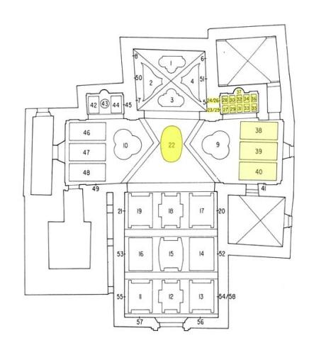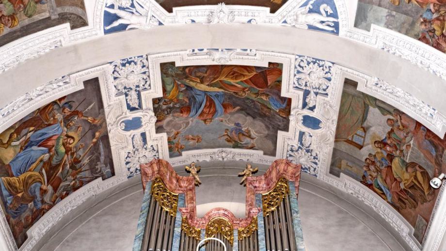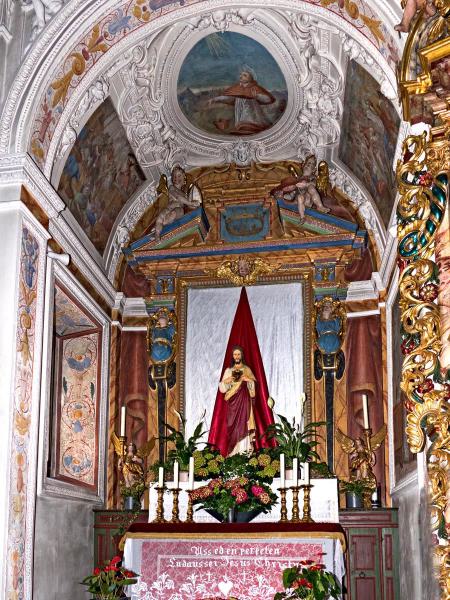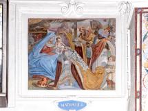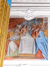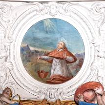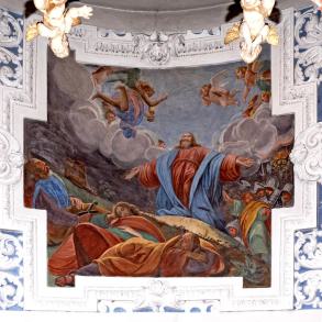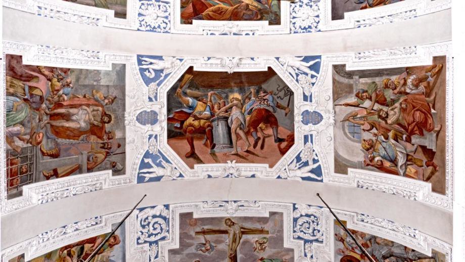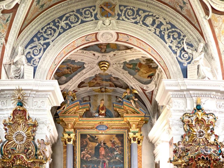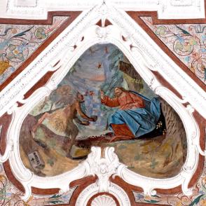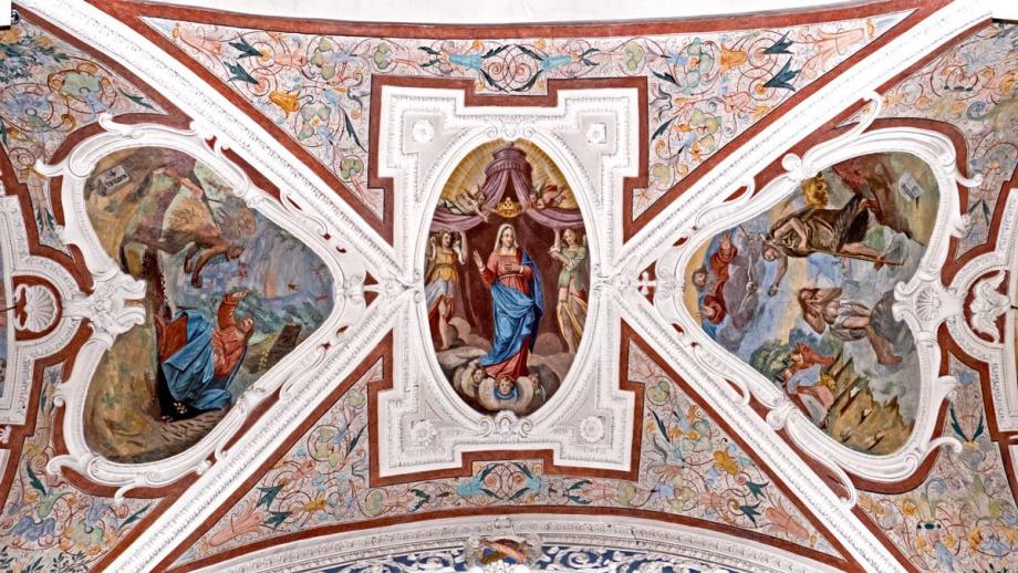 E) Am Gewölbe der Vierung: Immakulata, Taufe im Jordan, Versuchung. Diese gesamte Dekoration stammt offenbar von gleicher Hand, von dem oben genannten JOH. BAPT. MACHOLINO aus dem Val S. Giacomo. Die Bilder sind durch Übermalung entstellt; in der Komposition versucht der Maler bisweilen kühne Verkürzungen, die sein Können nicht zu bewältigen vermag. (Poeschel)