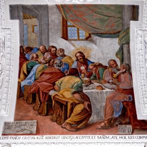 11 Abendmahl; Meisterinschrift links unten auf einer Tafel