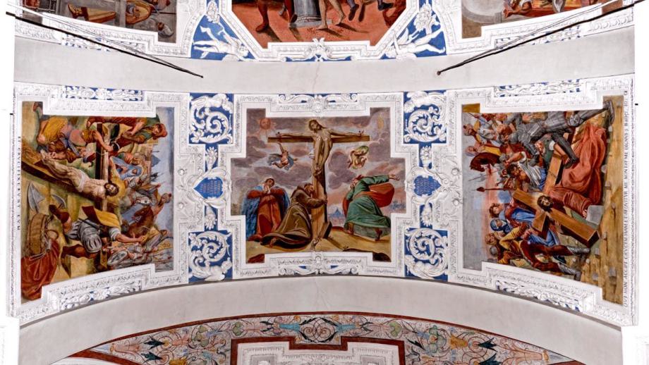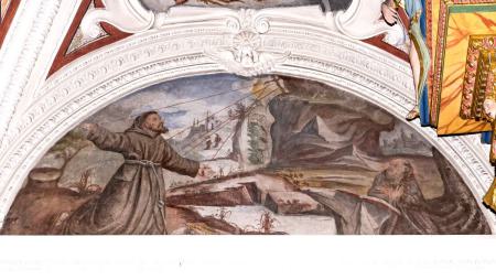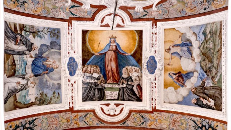 A) im Chor: am Gewölbe die Evangelisten, in den Schilden St. Franziskus und Felix von Cantalice, an den Wänden Szenen aus der Kindheit Christi.