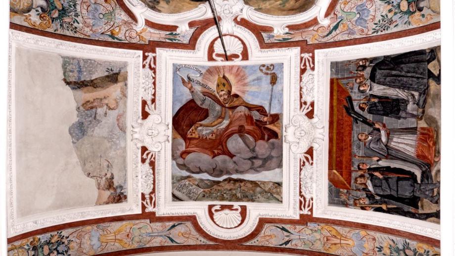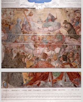 B) Am Gewölbe des Hauptschiffes: Passion und Himmelfahrt Christi in neun Szenen. Auf der Darstellung des Abendmahles die Meistersignatur: GO BAPTA MACOLINUS VALLIS SI JACOBI PINXI ANNO DOMINI 1639. Zu diesem Zyklus gehören auch noch zwei Bilder an den Wänden des Hauptschiffes: Beweinung, mit Stifterwappen Montalta, und Christus in der Vorhölle, mit Inschrift und Wappen des Canonicus Scholasticus Christian Cabalzar. An den Langhauswänden ferner die Hl. Familie und St. Martin.