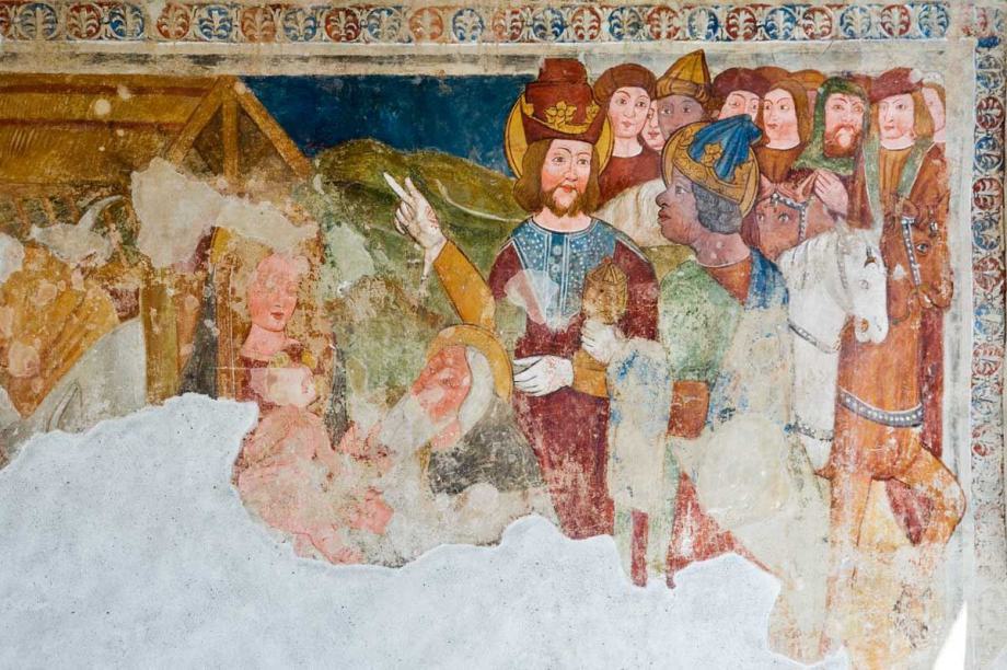 An der Westfront der Kirche rechts des Einganges wurden 1928 weitere Wandmalereien abgedeckt und von CHRISTIAN SCHMIDT in Zürich restauriert: unten ein Epiphanienbild, in dem - im Gegensatz zur Darstellung von S. Sievi zu Brigels nun Kaspar schon als Mohrenkönig charakterisiert ist. Darüber sieht man noch das Fragment eines Drachenkampfes des hl. Georg. Die Hauptpartien wurden bei Anlage der Vorhalle zerstört. Die Bilder sind - nach dem Gesichtsschnitt und dem rötlichen Inkarnat dem lombardischen oder tessinischen Maler der Fresken von St. Jakob und St. Martin (nicht von S. Sievi) in Brigels zuzuschreiben und demgemäss auf etwa 1515 zu datieren.