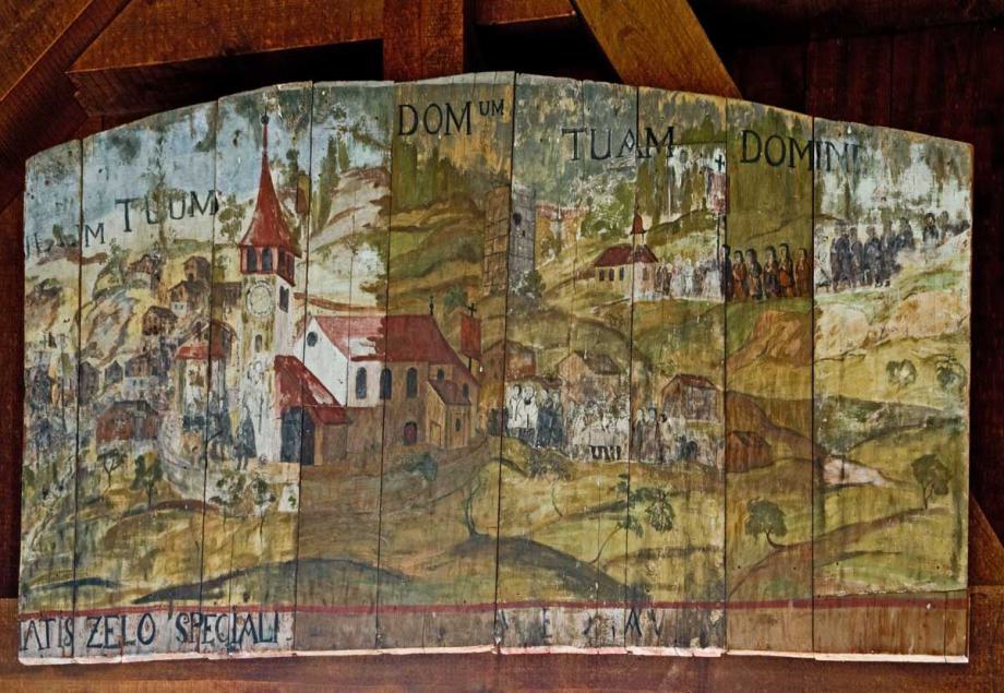 an der Südseite des Turmes,, dessen ganze Breite ausfüllend, eine Darstellung des "Gebotes der Feiertagsheiligung" wie in St. Georg zu Räzüns und in späterer Fassung in Waltensburg. Der Leidenschristus steht mit erhobenen Händen zwischen Symbolen der am Feiertag verbotenen Arbeiten; versinnbildlicht ist hauptsächlich die bäuerliche Tätigkeit, wie Pflügen, Getreideernte, Heuen, Einfahren, Butterbereitung, aber auch Fischen, Säumen u. a.; an den Beinen Christi sieht man noch einzelne, von den Handwerkssymbolen herzielende Linien, die eine Verletzung des Herrn durch die Übertretung des Feiertagsgebotes andeuten sollen. Letztes Viertel des 14. Jahrhunderts