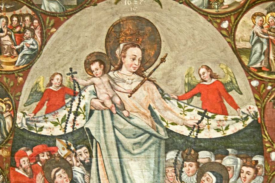 Das Bild stammt aus der Pfarrkirche, wo es nach dem Bericht von 1643 auf dem rechten Seitenaltar stand; zum Einbau musste es an den Seiten stark beschnitten werden. Die Komposition vereinigt das Bildschema der Rosenkranzkönigin mit der Mater misericordiae: unter dem ausgebreiteten Mantel der Maria Vertreter geistlicher und weltlicher Stände, vor ihr St. Dominikus und Katharina v. Siena, kniend den Rosenkranz empfangend. Das Ganze umrahmt von den 15 Medaillons der Marien-Mysterien. Datum 1627 und das Monogramm des Hans Jakob Greutter (Poeschel)
