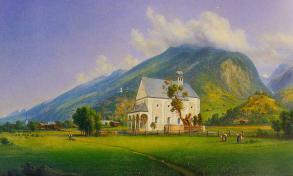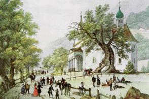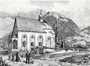 Holzschnitt von Alexander und Arthur Calame: St. Annakapelle in Trun, 1860