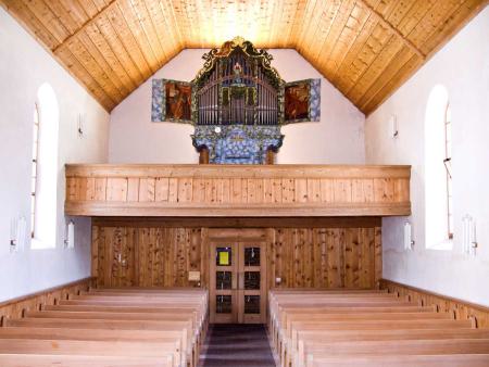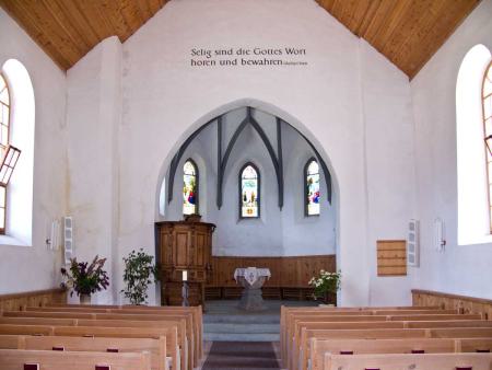Auffallend im Inneren ist der runde, dreiseitig geschlossene Chor mit Taufstein in der Mitte. Die Kanzel vermittelt zwischen Chor und Schiff. Die Glasmalereien in den Chorfenstern sind neueren Datums und ersetzten die alten aus dem 16. Jahrhundert, die 1912 verkauft worden waren.