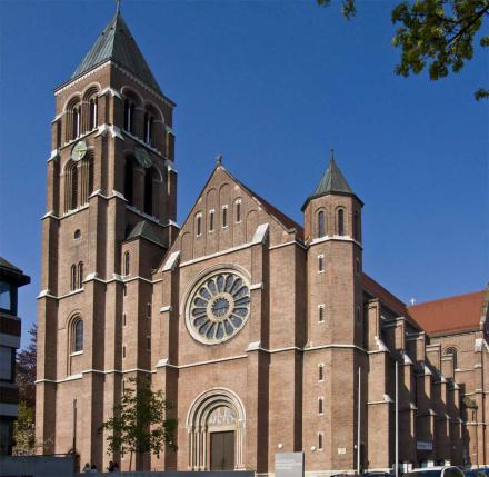 "Wuchtig und beherrschend steht die größte aller Stuttgarter Kirchen mit 1200 Sitzplätzen in dem rasch besiedelten Stadtteil. Sie hat die Grundform der altchristlichen, dreischiffigen Basilika. Der vorherrschend romanische Stil ist verbunden mit dem gotischen Baustil. Denn Architekt Cades, der Erbauer noch anderer Stuttgarter Kirchen, bereicherte den Bau neben romanischen Rundbogen auch mit einem gotischen Kreuzgewölbe, mit Gurten und Rippen. Spitzbogen und Strebepfeiler konnten am leichtesten den Seitendruck und Seitenschub des Hoch- und Mauerwerks auffangen. Beim Fliegerangriff 1944 brach das ganze Kreuzgurtengewölbe ein. Es wurde durch eine flache Holzdecke ersetzt. Der Außenbau ist reich gegliedert durch hervortretende Strebepfeiler und Schwibbogen. Der 40 m hohe Hauptturm hat fünf Stockwerke. Eine mächtige Fensterrosette an der Stirnseite und je eine am rechten und linken Teil des Querschiffes sind mit reichen Ornamenten geziert. Die Kirche besitzt einen großen, dem Bau gut eingegliederten Chorumgang mit 350 zierlichen Säulchen und Ornamenten, wie dies bei keiner Kirche unserer Diözese zu sehen ist. Die Galerien über den Seitenschiffen und dem Chorumgang schaffen zusätzlichen Raum für einige hundert Personen bei besonderen Anlässen. Mit den Stehplätzen vermag das Gotteshaus bei einer Länge von 60 m und einer Breite von 27 m 3000-3500 Personen zu fassen. Das Querschiff zwischen Langhaus und Chor bietet in den beiden Armen zwei Seitenkapellen Platz..."