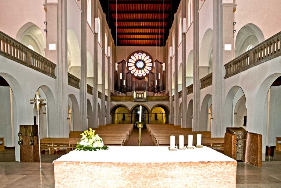 Taufstein, Altar, Ambo und Tabernakel hat 1964 Josef Henger aus Trientiner Marmor und Bronze geschaffen.