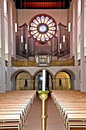 Die große Rosette über der Orgel zeigt den wiederkehrenden Herrn, umgeben von den sieben Posaunenengeln (Offb 8) und den sieben Schalenengeln (Offb 15), Gerichtsengel mit der Sichel (Offb 14,17) und Engel mit dem Buch des ewigen Ratschlusses Gottes (Offb 10,2).