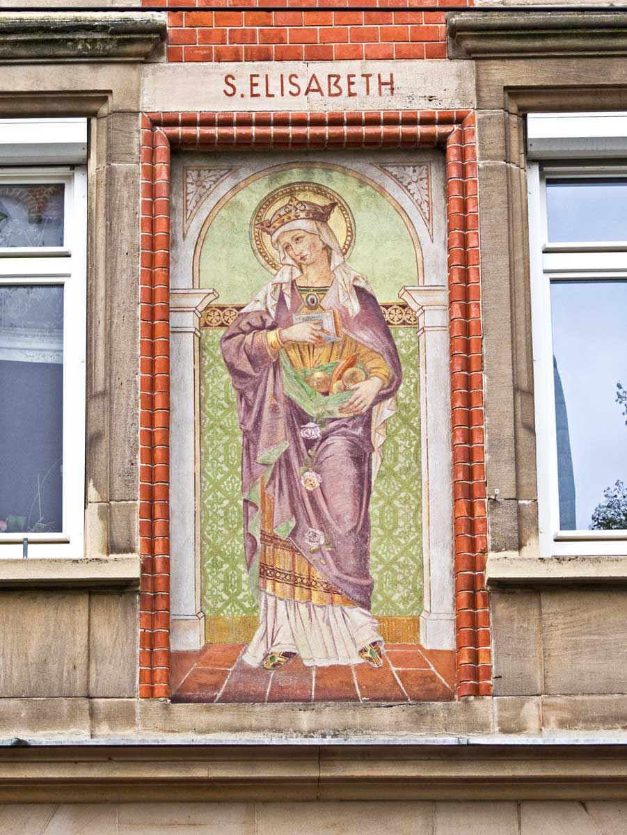Die heilige Elisabeth (bislang an der rechten Querhauswand) hat als Namenspatronin der Kirche ihren Platz mitten in der Gemeinde am linken Vierungspfeiler erhalten. Die farbig gefaßte, hölzerne Statue ist eine Kopie einer Figur von Tilman Riemenschneider.