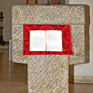 Für das kostbare Evangeliar wurde in St. Elisabeth ein Thronus geschaffen. Nach dem Evangelium wird das Evangeliar vom Priester, begleitet von den Akolythen, in feierlicher Prozession dort hin getragen und sichtbar für die Gemeinde abgelegt. Der Thronus ist aus Plexiglas und Stahl für den Ambo von Alfred Appenzeller gestaltet. Quelle: Website Kreuz + Kreuz Freie Architekten