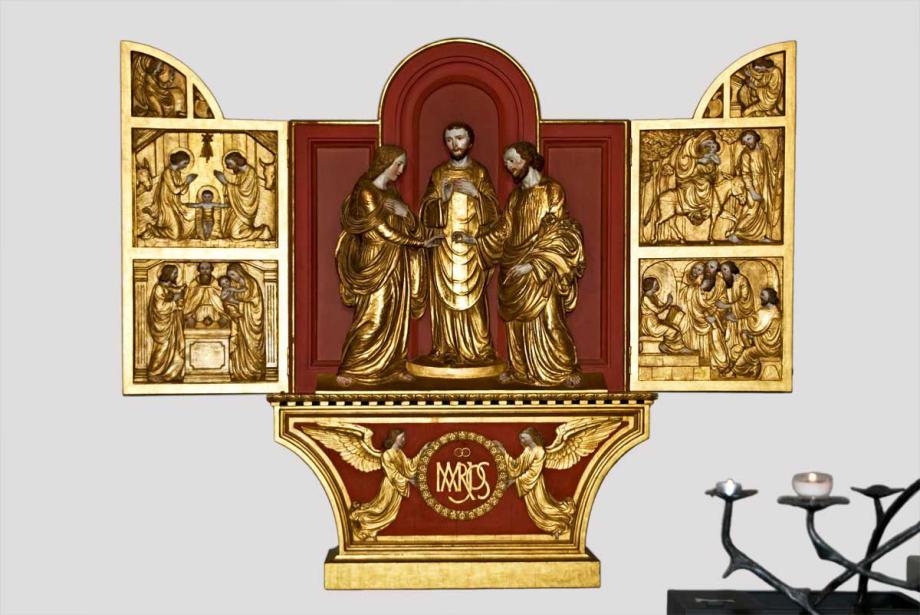 Die halbplastische Figurengruppe der Vermählung Mariens (vor 1969 Teil eines Flügelaltars unter der Empore im linken Querhaus, nach 1969 an der linken Querhausrückwand aufgehängt) wurde ergänzt mit einer neuen Rückwand und vervollständigt mit der alten Predella sowie den beiden vergoldeten Flügeln, die in schöner Reliefschnitzerei Bilder aus dem Leben Mariens zeigen. Die Gruppe hängt an der linken Querhausstirnwand, thematisch der beherrschenden Marienstatue im linken Querhaus zugeordnet, gestalterisch als Gegenstück zur Gruppe der sechzehn Heiligen im rechten Querhaus.