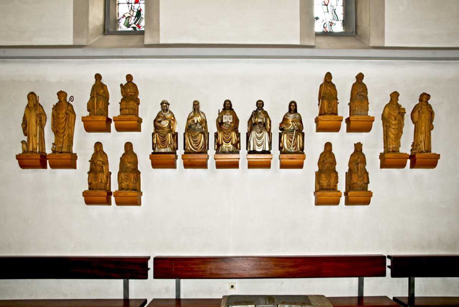Die Holzskulpturen von Christus und sechzehn Heiligen (vor 1969 Schmuck von Kanzel und Altären, nach 1969 rechts und links auf Konsolen an den Wänden des Chorraums aufgereiht) wurden zu einer Gruppe von Heiligen zusammengefaßt, die sich stehend und sitzend um Christus scharen. Die Figurengruppe ist an der rechten Querhausstirnwand hinter dem Taufstein angeordnet, also dort, wo die Kinder im Sakrament der Taufe den Namen eines Heiligen erhalten.