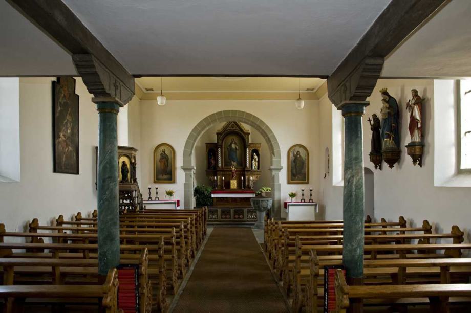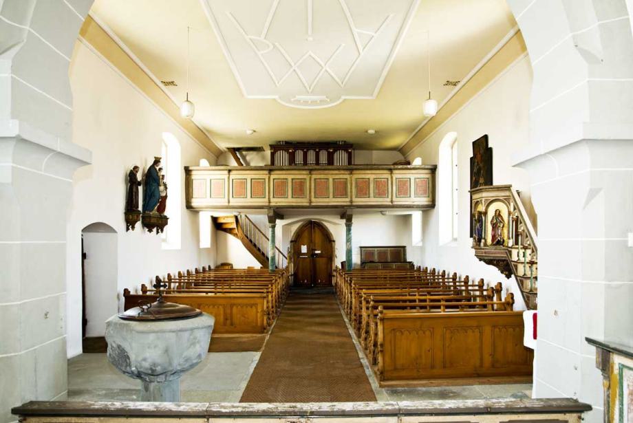 Die heutige Kirche entspricht im Wesentlichen einem um 1468/69 errichteten spätgotischen Bau. Zu den älteren Teilen zählen der um 1230 entstandene spätromanische Chorbogen und das Erdgeschoss des Turms mit einer steinernen Wendeltreppe. Die Innenausstattung wurde wiederholt verändert und dem jeweiligen Zeitgeschmack angepasst. Das heutige Erscheinungsbild wird von der neuromanischen Gestaltung der Jahre 1864 - 1869 geprägt. Der Taufstein stammt noch aus dem 15. Jh.