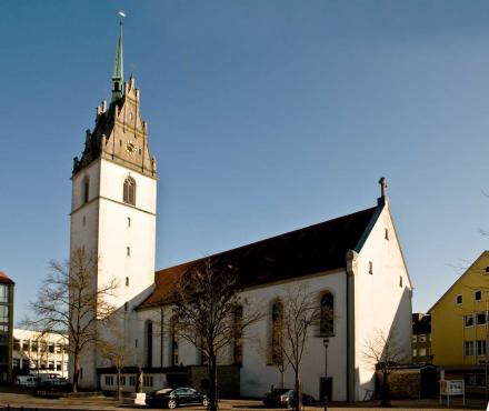 Rechts neben dem Kirchturm St. Nikolaus ist auch der Kirchturm von St. Petrus Canisius zu sehen