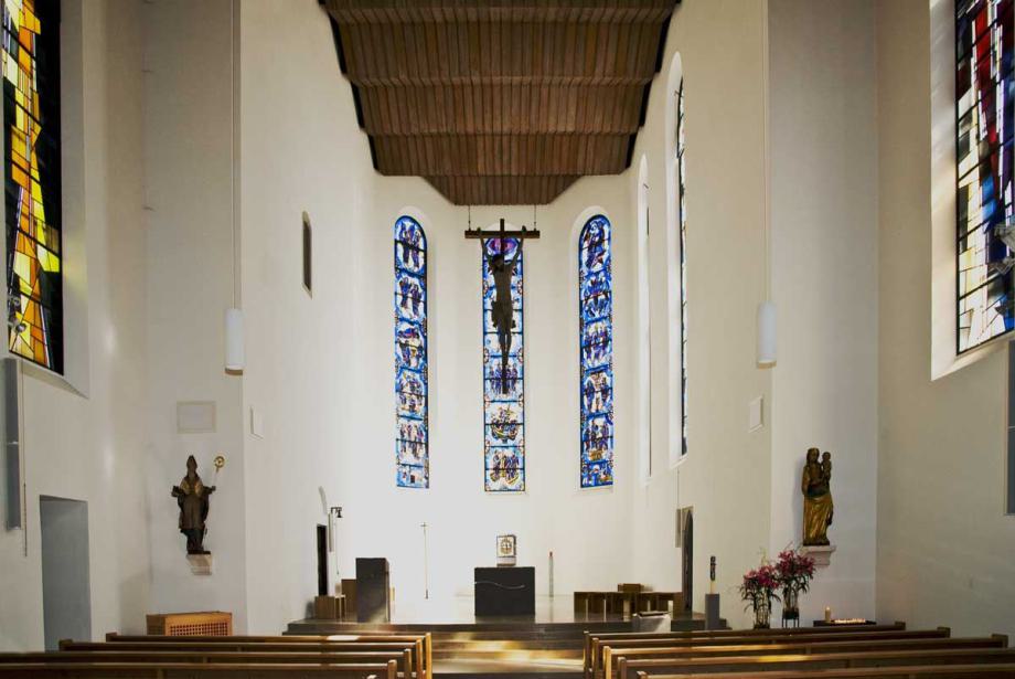 Die beiden seitlichen Chorfenster rechts und die Fenster im Kirchenschiff wurden 1962 von Roland Peter Litzenburger gestaltet. Sie symbolisieren ebenfalls Christus (rechte Seite) und Maria (linke Seite). Ihre Farbigkeit taucht das Kircheninnere in ein besonderes Licht und fördert zugleich die Konzentration auf den spirituellen Raum.