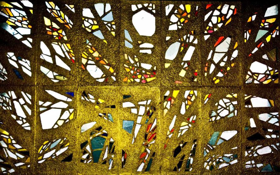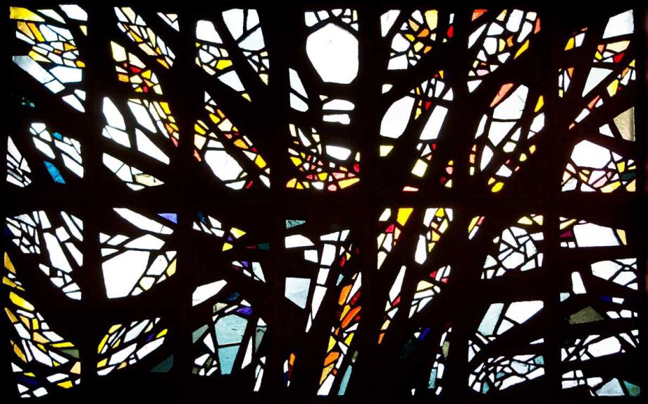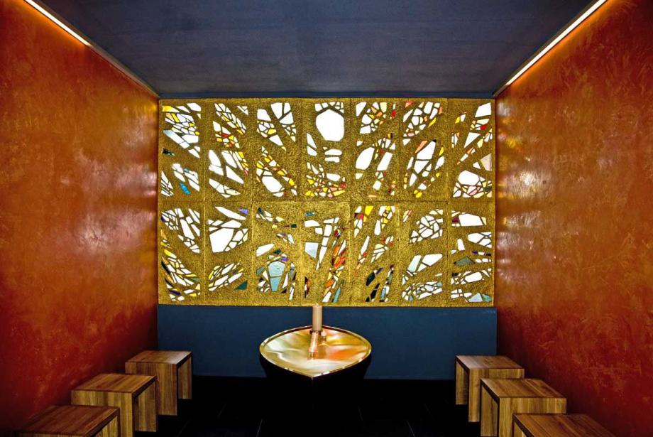 Der Raum ist durch die von Roland Peter Litzenburger gestaltete Glaswand "Brennender Dornbusch" in ein freundliches, warmes Licht getaucht. Künstlerisch hat er eine Geschichte umgesetzt, die im Buch Exodus aufgeschrieben ist und zu den wichtigsten der jüdisch-christlichen Bibel gehört. Gelb, orange und rot sind die Farben des Feuers; rot ist in der Liturgie auch die Farbe des Heiligen Geistes. Denn dieser kann wie Feuer die Herzen der Menschen ergreifen. Ergriffen war Mose, als er in der Wüste im "brennenden Dornbusch" seinem Gott begegnet. Im Feuer offenbart sich dieser Gott mit einem Namen, der zeigt wie dieser Gott ist: "Ich bin da". (Ex 3,14) Und Mose begreift die Botschaft.