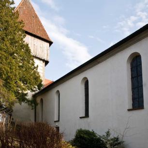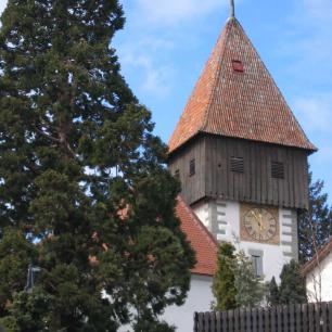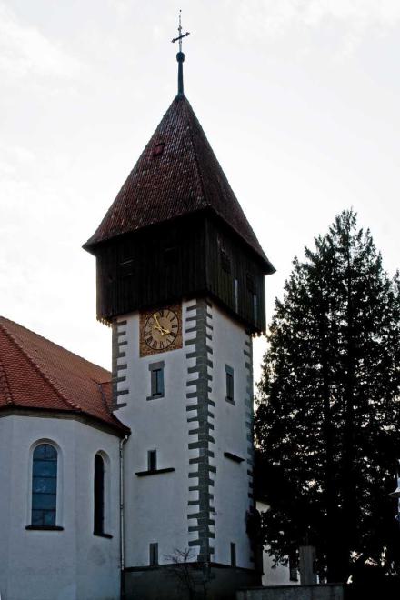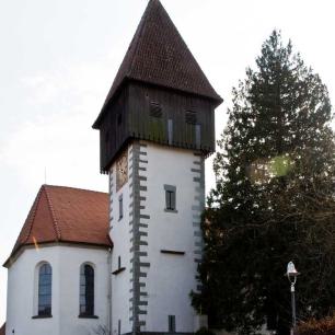 "Der ortsprägende Kirchturm (erbaut um 1420) ist zusammen mit der mächtigen Wellingtonia (Riesenmammutbaum) das Wahrzeichen von Allmannsdorf. Dieser Chorflankenturm ist der älteste erhaltene Teil der Kirche. Um 1745 ist der Kirchenraum in seinen heutigen Abmessungen ohne den Altarraum entstanden. Von dem gotischen Kirchlein ist nur das Sakramentshäuschen erhalten geblieben. In den letzten 2 Jahrhunderten ist die Innengestaltung immer wieder verändert worden.