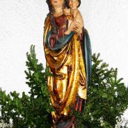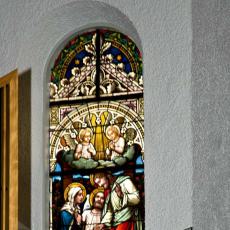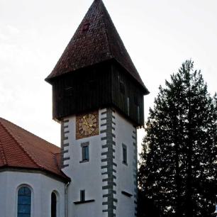 Der wehrhaft anmutende Kirchturm stammt aus dem 13. Jahrhundert und ist auch heute zusammen mit der über 100 Jahre alten Wellingtonia ein weit sichtbares Wahrzeichen unseres Ortes. Das bescheidene gotische Kirchlein wurde 1845 durch einen Neubau ersetzt, der heute im wesentli chen noch unsere Pfarrkirche bildet. Die ständig steigende Anzahl der Gemeindemitglieder war 1960 der Anlass zu einer Umbaumaßnahme, die zu einer Verdoppelung des Platzangebotes im Kirchenschiff führte. An den Westgiebel wurde ein neuer Chorraum angebaut und der Hauptzugang durch den ehemaligen Altarraum geschaffen. 1984 wurde der Chorraum umgestaltet, um der Liturgiereform Rechnung zu tragen.