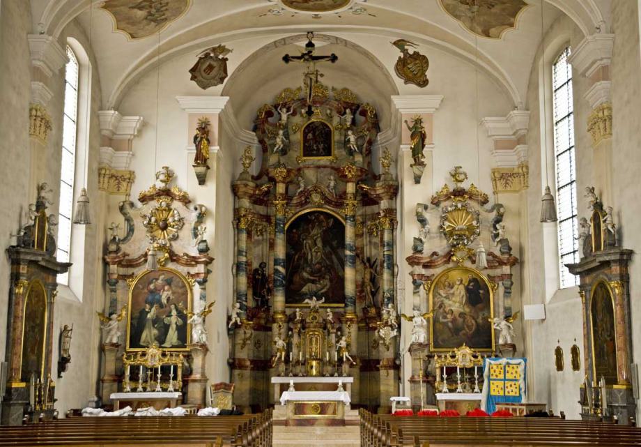 "Die Katholische Pfarrkirche St. Martin ist eine der Perlen an der Oberschwäbischen Barockstraße und von kunstgeschichtlicher Wertschätzung. In lichter Heiterkeit zeigt sich hier die Bau- und Gestaltungskunst des Barock" - ist auf der Website der Gemeinde Langenargen zu lesen. Dort ist die Kirche kurz vorgestellt, ausführlichere Informationen findet man einerseits auf Wikipedia, andererseits im Führer "Die katholische Pfarrkirche SANKT MARTIN IN LANGENARGEN", verfasst von Dr.Otto Beck, in 4. überarbeiteter Auflage im Jahr 1994 im Verlag Schnell & Steiner GmbH Regensburg erschienen.