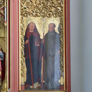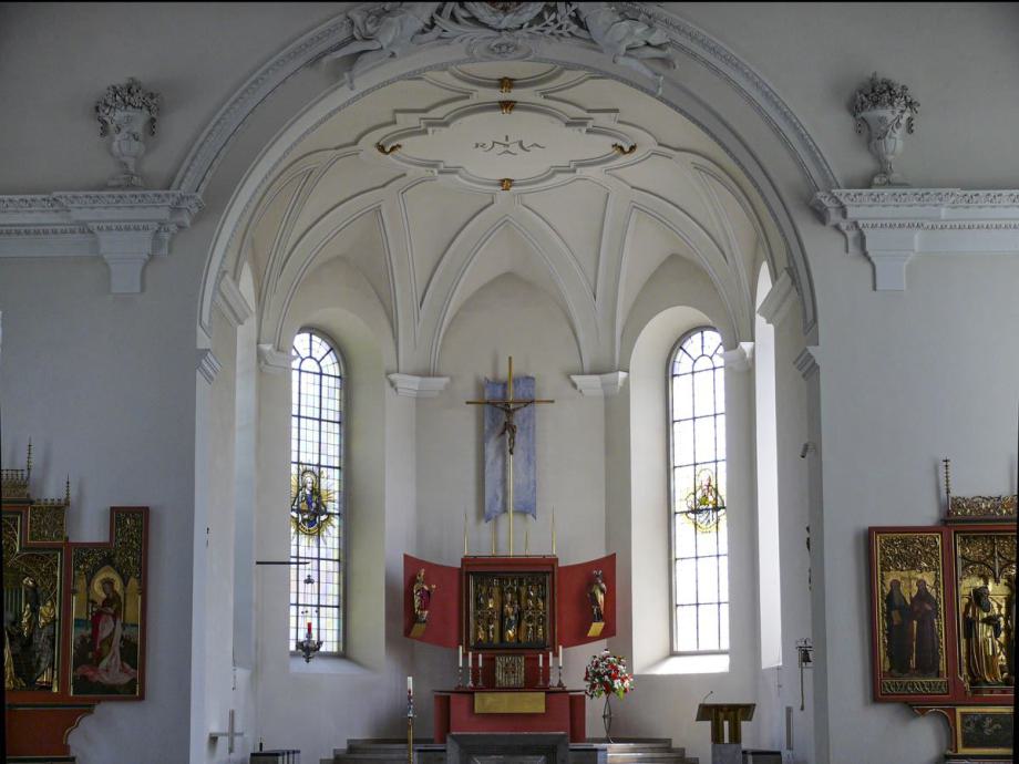 Der Hochaltar ist im Mittelteil ein spätgotischer Schrein aus dem 15. Jahr-hundert aus der Nähe von Weimar. Über Umwege kam er bei der Innenrenovation 2002 an diese Stelle. Es stellt in der Mitte die Gottes-mutter Maria mit dem Jesuskind dar. Umgeben von verschiedenen Heiligen. Das Kreuz darüber mit seinem barocken Korpus lässt durch den blauen Grund österliche Hoffnung anklingen. Über dem Schrein moderne Andeutungen von Sprengwerken. Auf den angedeuteten Außenflügeln sind der Heilige Bischof Konrad, und der heilige Pelagius dargestellt. Beides Patrone des früheren Bistums Konstanz. Meersburg war ja bis zur Säkularisation Residenz der Konstanzer Bischöfe. Reliquiare beider Heiligen hängen in barocker Fassung über den beiden seitlichen Türen des Chorraumes.