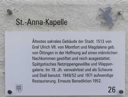"Die Sankt-Anna-Kapelle ist wohl der älteste original erhaltene Raum Tettnangs aus der Spätgotik 1513. Graf Ulrich VII und Magdalena von Öttingen erbaten mit dieser frommen Stiftung und dem Patrozinium der heiligen Anna einen männlichen Erben.