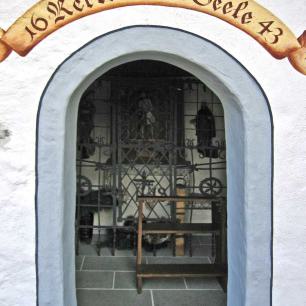 Das schöne schmiedeeiserne Gitter stammt aus der Zeit des Kapellenbaus. Im oberen, halbrunden Feld befinden sich die Arma Christi. Dies sind die Leidenswerkzeuge Christi, die oft wappenartig mit Nägeln, Leiter, Lanze und Rohr angeordnet sind. Unten am Gitter ist ein hölzerner Opferstock mit geschmiedeten Beschlägen befestigt."