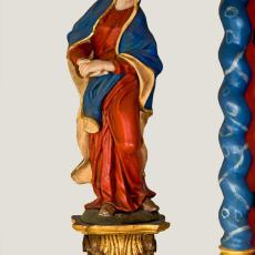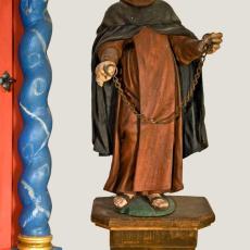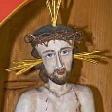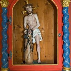 Ein massiver Sandstein-Quader mit einer Sandstein-Platte bildet den Altar. Darauf erkennt man eine qualitätvolle Renaissance-Malerei mit dem Christusmonogramm IHS (Jesus Hominum Salvator = Christus, Heiland der Menschen; im Volksmund auch: Jesus Heiland Seligmacher), ein Kreuz, Blumen und reiche Ornamentik. Auf der Altarplatte ruht ein hölzernes Tabernakelschränkchen aus dem 17. Jahrhundert. Die drei Heiligenfiguren sind eindrucksvolle Zeugen bäuerlichen Barocks: Christus an der Geißelsäule, die trauernde Gottesmutter und ein Mönch. Die Mönchsfigur ist mit hoher Wahrscheinlichkeit der Heilige Leonhard, denn eine aus der Zeit stammende und zu ihm passende Kette (sein typisches Attribut) wurde im Kapellchen gefunden. Die Christusfigur ist eine Nachbildung des gegeißelten Heilands aus der berühmten Kirche Die Wies bei Steingaden.