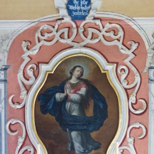 "Die erste Kapelle datiert auf das Jahr 1685. Sie litt aber in den Kriegswirren und war bald baufällig. Deshalb wurde 1722 ein Neubau errichtet und der unbefleckten Empfängnis Mariae geweiht. Der nur noch zum Teil erhaltene Deckenstuck und die Altardekoration stammen aus der Zeit der Erbauung."