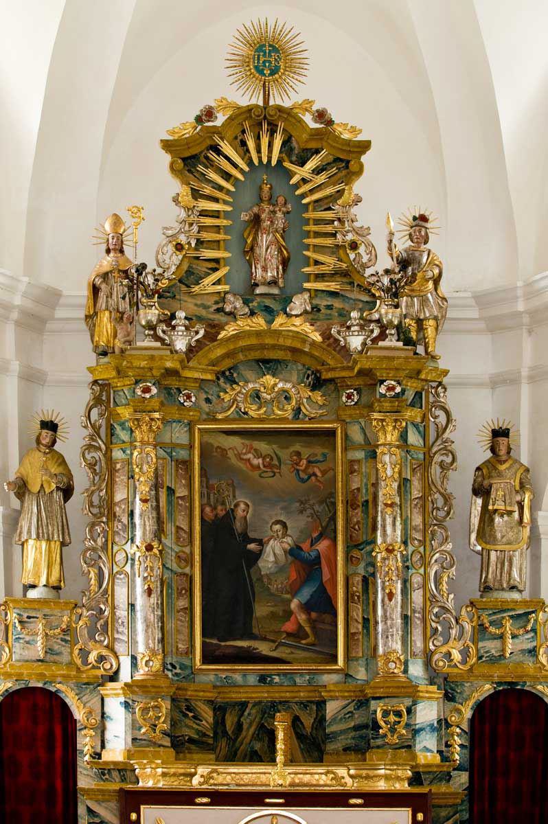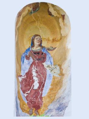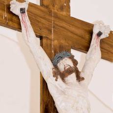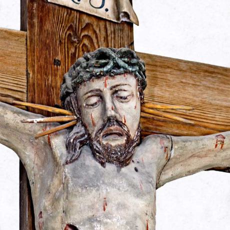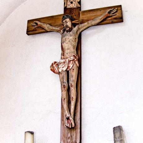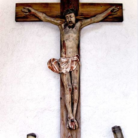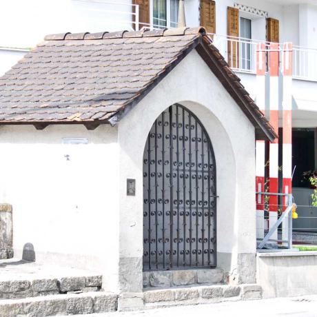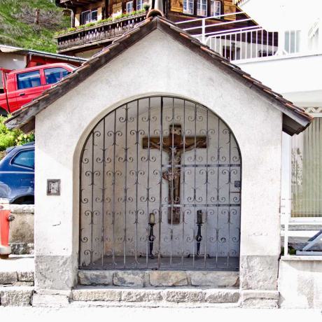 Zwischen der Placidus-Kirche und dem Kloster steht auf der rechten Straßenseite ein Crucifix in einer Kapelle: