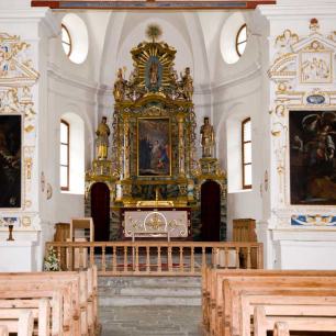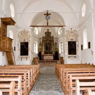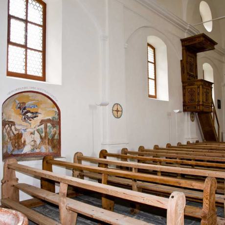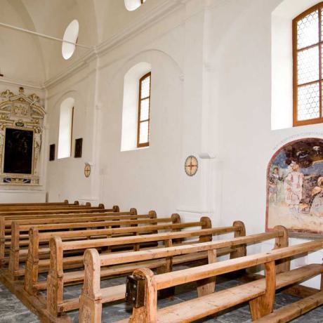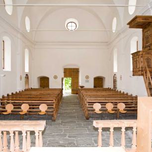 Anders als die beiden Vorgängerbauten ist die Kirche in der Längsachse nach Norden ausgerichtet, damit ihr massiver Turm als Lawinenbrecher wirken kann. Rechts und links der Eingangstüren sind Malereien der Klosterheiligen Sigisbert von Disentis und Placidus angebracht. Lediglich die beiden Seitenaltäre stammen aus der Zeit um 1655. Der Hochaltar stammt aus der zweiten Hälfte des 18. Jahrhunderts, die Kanzel aus der Zeit um 1800."