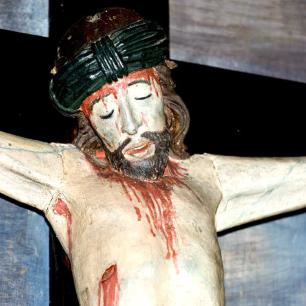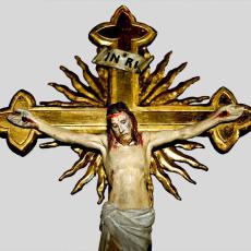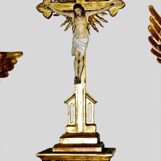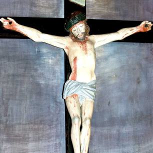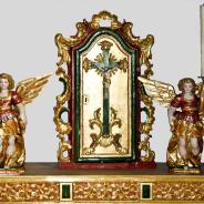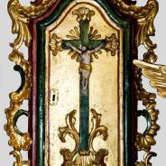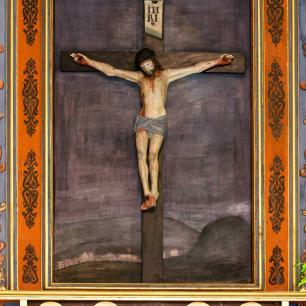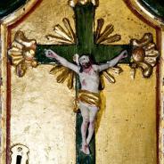 Altarbild mit dem Gekreuzigten. Die spätgotische Predella von 1490 wurde 1643 von Filisur gekauft. Darstellung: Leidenschristus, Maria und Johannes, flankiert von den Aposteln Petrus und Paulus.
