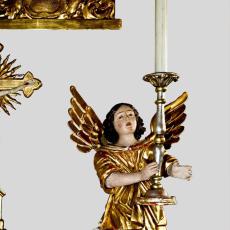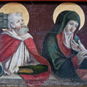 Hl. Barbara (mit Turm) Hl. Maria Magdalena (mit Salbölgefäss) Maria Verkündigung und die Weihnachtskrippe (nur zum Teil sichtbar) Hl. Martin (mit Mantel und Bettler, unvollständig)