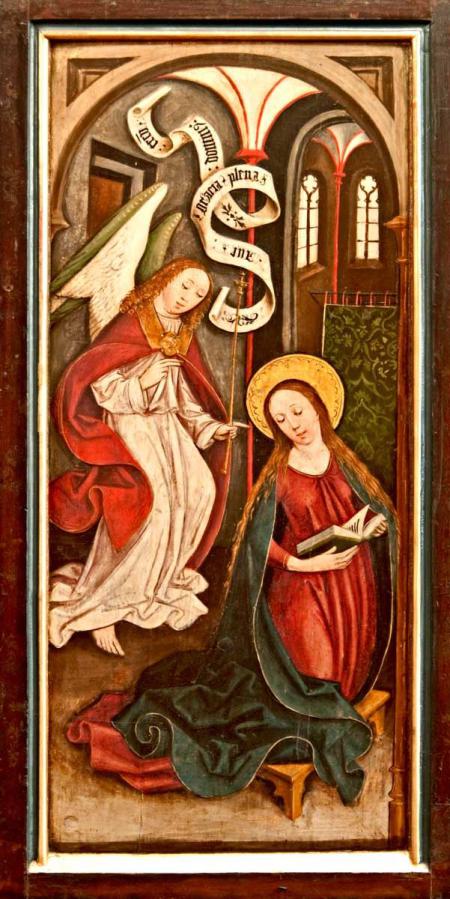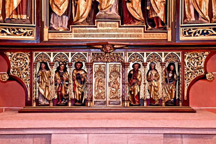 Predella mit sechs Heiligen unter Arkaden; in der Mitte Tabernakel mit Verkündigungsrelief. Text der Sockelinschrift: