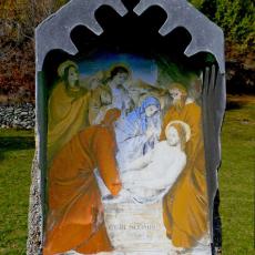 Und Joseph nahm den Leib und wickelte ihn in eine reine Leinwand und legte ihn in sein eigenes Grab, welches er hatte lassen in einen Fels hauen, und wälzte einen großen Stein vor die Tür des Grabes und ging davon. Es war aber allda Maria Magdalena und die andere Maria, die setzten sich gegen das Grab.