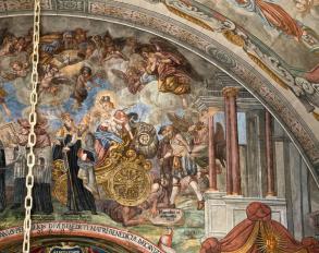 Der Zug wird geleitet von St. Benedikt, gefolgt von den Mönchen Beda, Bernhard, Maurus, Adalgott. Dann paarweise Erzbischöfe, Kardinäle, Päpste den Triumphwagen Mariens ziehend.