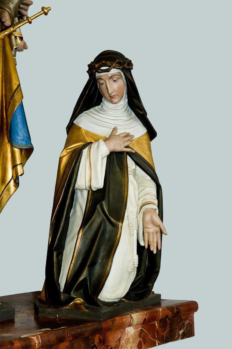 Attribute: Lilie, Buch, Kruzifix, Dornenkrone, Herz, Stigmata, Ring, Taube, Rose, Totenschädel und Schiffsmodell mit dem päpstlichen Wappen