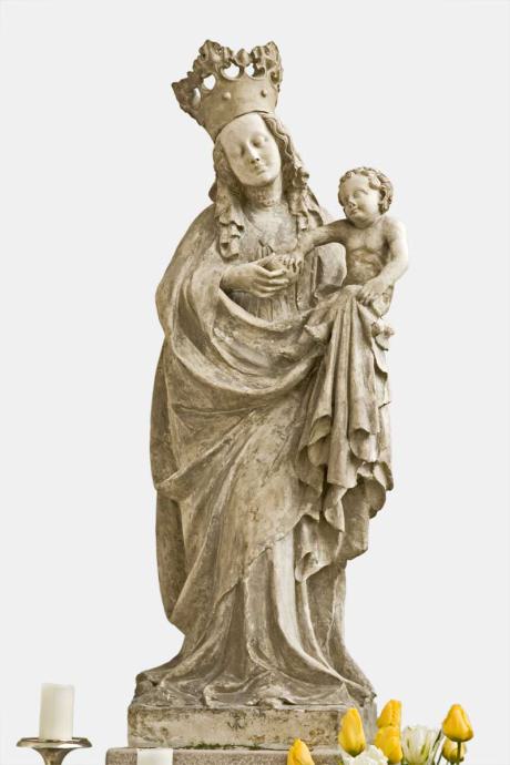 Weil ich vermutlich von Anfang an eine Krone hatte, die allerdings 1917 nicht mehr vorhanden war, schuf mir der Restaurator eine neue, die ich jetzt noch trage. Die demütige Magd des Herrn - und solch eine Krone? Ich glaube, man sieht es mir an, wie sie mich niederdrückt. Nach der Renovierung der Stiftskirche wurde ich 1987 hier im Frauenchörle aufgestellt. Hier werde ich von den Kunstkennern bestaunt und bewundert. Am meisten freue ich mich jedoch über die Besucher, die zu mir kommen, um zu beten.