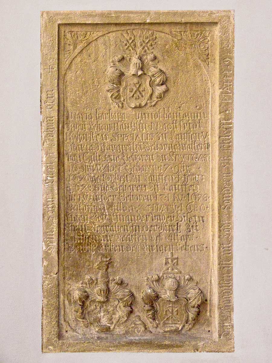 Maria barbara unndt beniamin zwey Lehenpfläntzlin M. gottfridt Kuhorsten Specialis zu Lauffen u. Maria Margarethä Geborner von Calb. Jene Geboren zu Stutgart 16.9br wider Geboren 17.9br. 1676 gestorben zu Lauffen 1. Febr: 1678. Diser Geboren zu Lauffen 11. May wider Geboren 12. May 1678 Gestorben Allda 25. Marty 1680 Ligen bey Einander under disem Stein begraben In der Kirch zu Lauffen zur Rechten des Altars Gewise Erben des Ewigen Lebens.