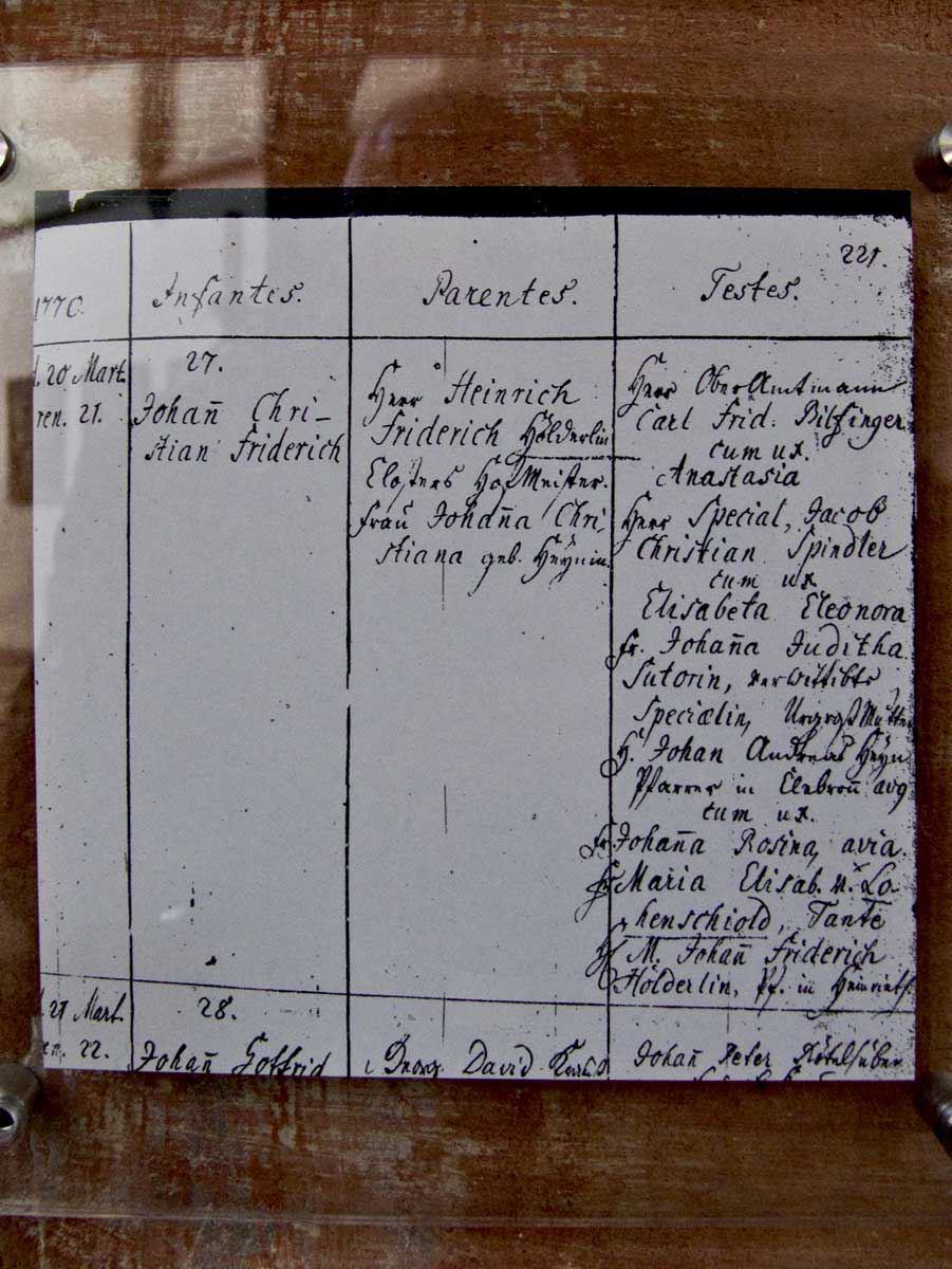 Hier wurde am 21. März 1770 der kleine Friedrich Hölderlin getauft, nach damaligem Brauch einen Tag nach seiner Geburt.
