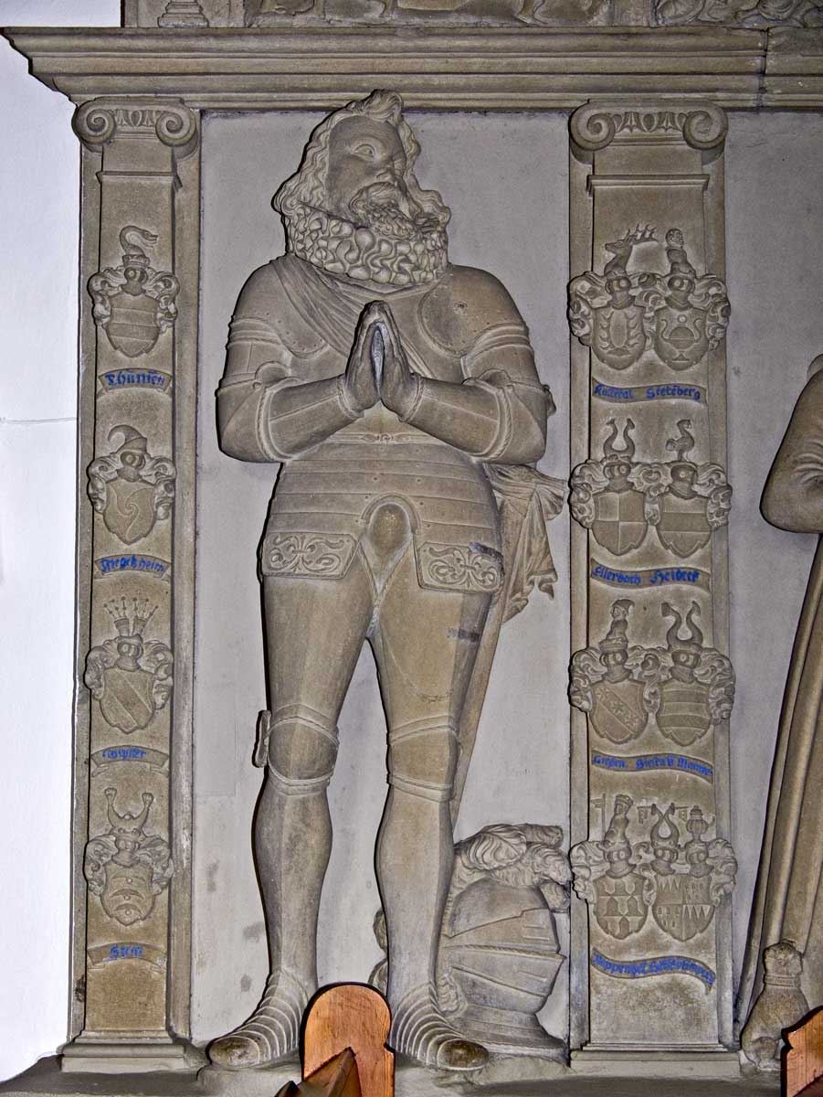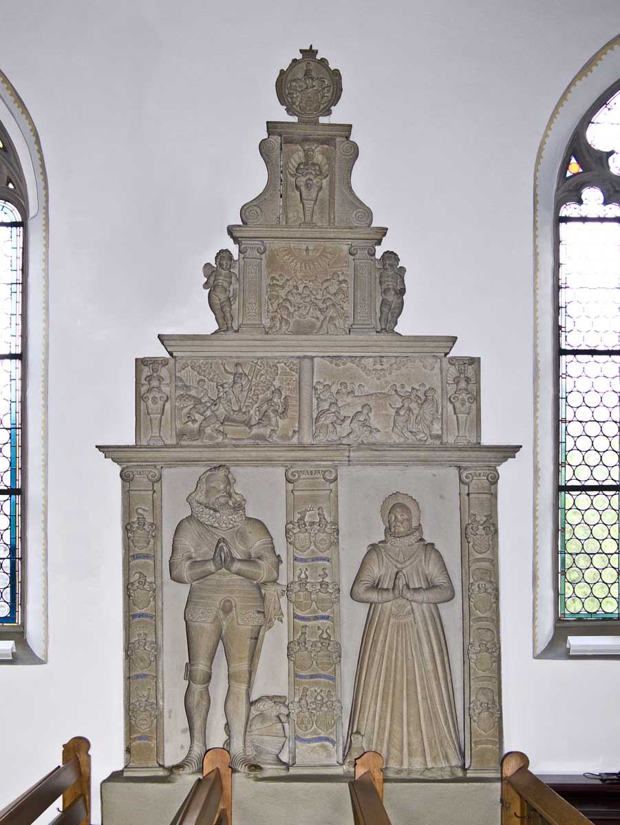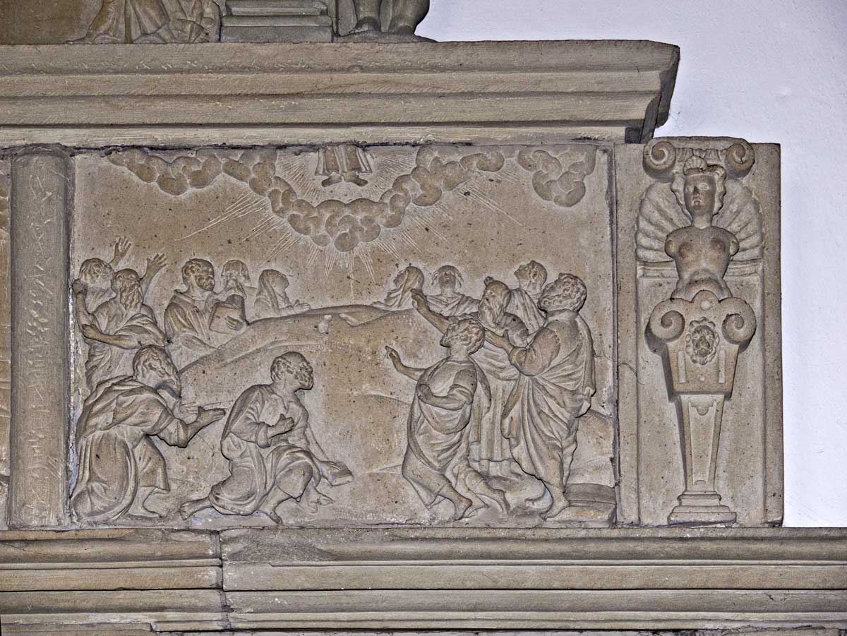 Um die großen Grabmale finden sich verschiedene Ahnenwappen eingehauen. Über den beiden Figuren ist die Darstellung von der Auferstehung Christi, der Himmelfahrt und Pfingsten.