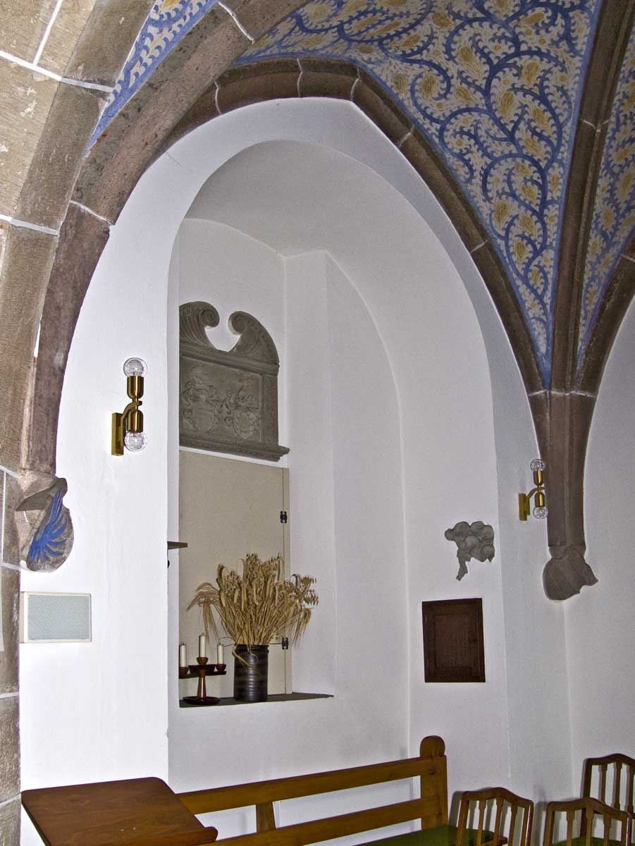 Die Wappen finden sich wieder im Chor. Im Schlussstein des Kreuzrippengewölbes das Wappen der Thumb, an den Eckpfeilern jeweils ein Wappen der von Thumb (farblos), der von Kaltental (blaue Geweihstangen) und von Sachsenheim (rot).