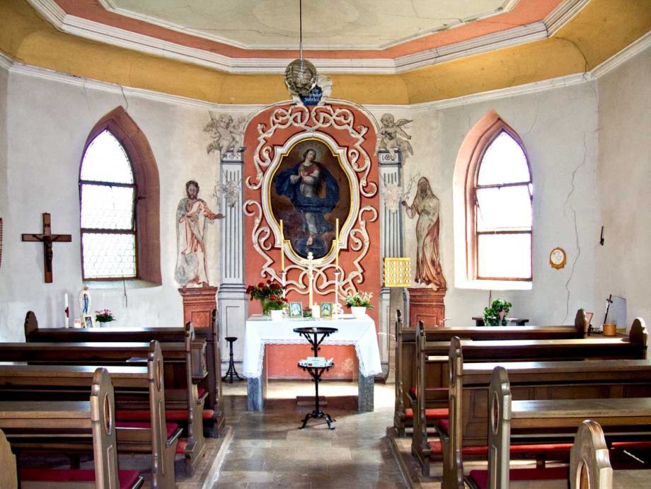 "Die erste Kapelle datiert auf das Jahr 1685. Sie litt aber in den Kriegswirren und war bald baufällig. Deshalb wurde 1722 ein Neubau errichtet und der unbefleckten Empfängnis Mariae geweiht. Der nur noch zum Teil erhaltene Deckenstuck und die Altardekoration stammen aus der Zeit der Erbauung."